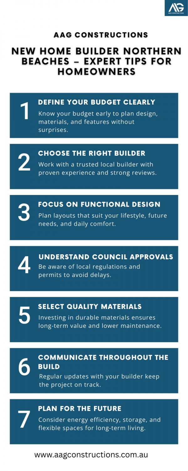 Building a new home is an exciting step, and choosing the right builder in the Northern Beaches can make the journey smooth and stress-free. At AAG Constructions, we guide homeowners through every stage with clear advice and honest communication. Start by setting a clear budget so you know what is possible from the beginning. Focus on a practical design that suits your lifestyle today and in the future. Understanding approvals and timelines helps avoid delays and surprises. Using quality materials ensures your home is strong and long-lasting. Most importantly, stay involved and ask questions along the way. With AAG Constructions, you can build a comfortable, stylish home your family will enjoy for many years.