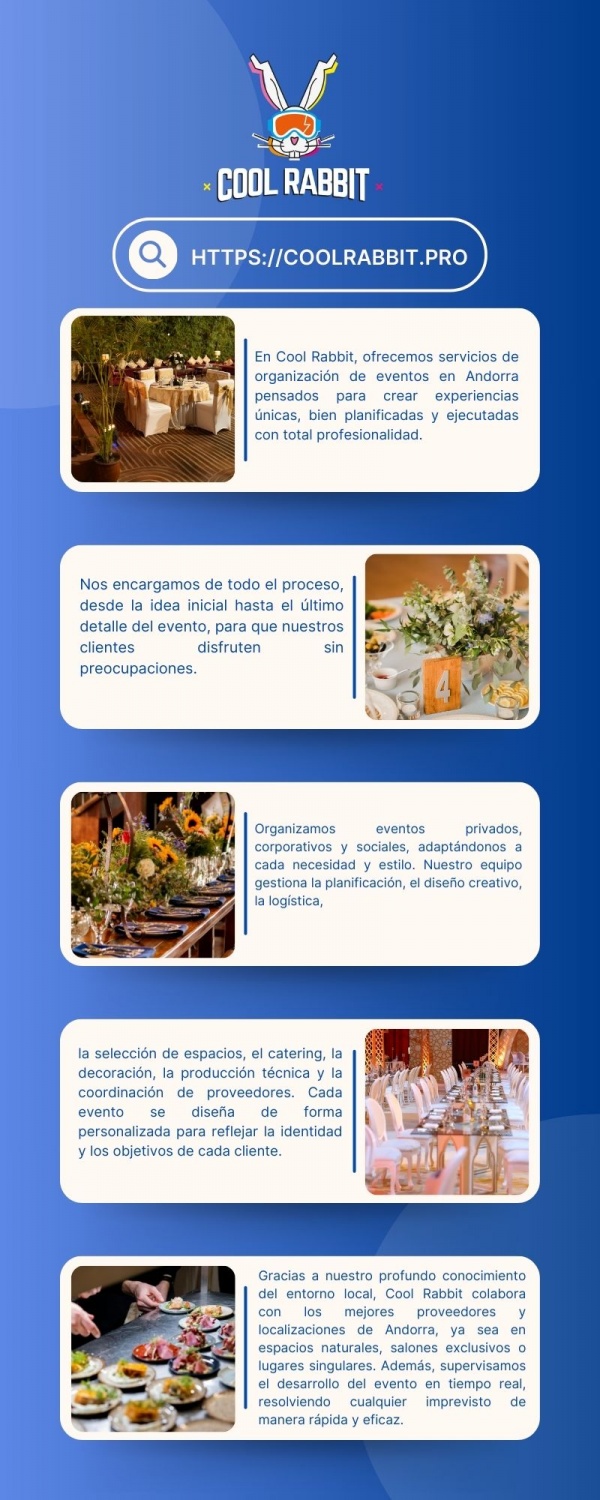 En Cool Rabbit, ofrecemos servicios de organización de eventos en Andorra pensados para crear experiencias únicas, bien planificadas y ejecutadas con total profesionalidad. Nos encargamos de todo el proceso, desde la idea inicial hasta el último detalle del evento, para que nuestros clientes disfruten sin preocupaciones.