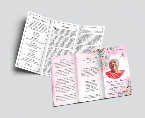 "Honor the memory of your loved one with our 3-panel Funeral Program, offered in a letter-size (8.5"" x 11"") format. Choose from premium paper options such as 100 lb Gloss Cover, 12 pt Soft Touch, 65 lb Matt White, and 80 lb Natural Cover Matt. This customizable program allows you to include up to 15 photos, personalized text, and ceremony details, creating a meaningful tribute.