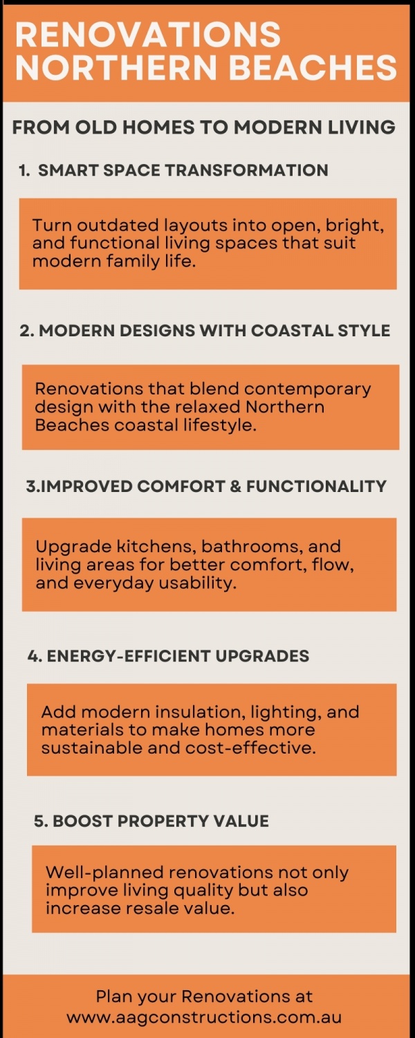 Old homes have a special charm, but they often need a fresh touch to suit today’s lifestyle. Renovations in the Northern Beaches help transform outdated spaces into modern, comfortable, and stylish homes. From improving layouts to adding more natural light, every renovation is planned to make daily living easier and more enjoyable. Whether it’s upgrading kitchens, bathrooms, or entire homes, the focus is on smart design and quality finishes. Modern renovations also help increase property value while keeping the character of the home intact. With the right planning and skilled professionals, an old house can be turned into a beautiful modern living space that feels new, fresh, and welcoming for years to come. If you are looking for the best builder who can design or work best for your homes, then you should go to Aag Constructions. The best team with the best creation you should definitely love.