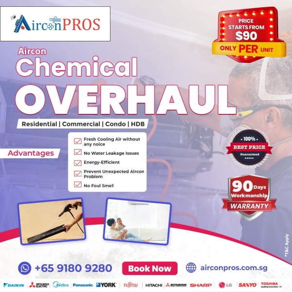 Ensure your air conditioner performs at its best with our chemical overhaul service in Singapore, now just $90 per unit. At Airconpros, our skilled technicians thoroughly dismantle and clean each component, removing stubborn dirt and mold to restore your aircon's efficiency. This deep cleaning process enhances cooling, prevents breakdowns, and extends your unit's lifespan. For reliable and affordable aircon service, trust Airconpros to keep your indoor environment cool and comfortable. Book your chemical overhaul today!