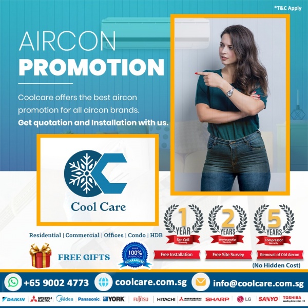 AIRCON PROMOTION Cool care Aircon service provides aircon promotion for all major Aircon brands. Here you can purchase all models of aircon at an affordable price with Free Installation. +65 9002 4773. Enquire now Cool care is one of the top aircon companies in Singapore. We provide all brands of air conditioners for residential and commercial etc.,