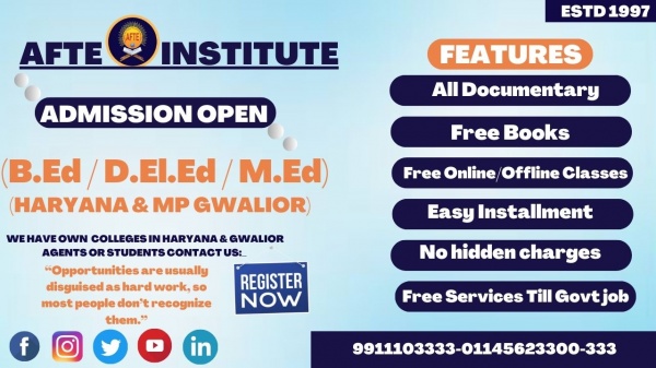 "AFTE Institute facilitates B.Ed admission in MDU (Maharshi Dayanand University). Aspiring educators seeking to pursue a Bachelor of Education degree can benefit from AFTE's guidance and support throughout the admission process. With AFTE Institute's assistance, individuals can navigate the application requirements and procedures smoothly, ensuring a seamless transition into the esteemed B.Ed program at MDU. Prepare to embark on a fulfilling journey in the field of education with AFTE Institute's comprehensive support."