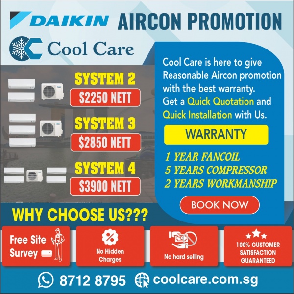 Daikin Aircon promotion in Singapore. CoolCare Offers Daikin inverter Air conditioner gets a quote for system 1, system 2, system 3, system 4 configurations.