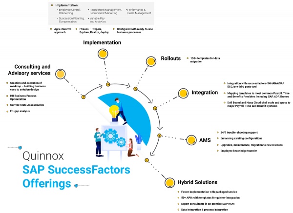 SAP SuccessFactors services offer cloud HR, talent management, and workforce analytics. Consulting, implementation, and management are among our offerings in this industry. These services are bought by HR leaders, IT and sourcing executives to standardize, unify, and update HR or talent management systems throughout the world or as the impetus for transforming the HR operating model. As IT experts we help organizations install a cloud-based solution quickly and maintain its functioning. Quinnox offers the best industry-standard SAP SuccessFactors integration and support. Get in touch to learn more!