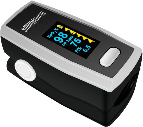 The Santamedical finger pulse oximeter measures your blood oxygen saturation and pulse rate. This device is designed for occasional and spot check monitoring.