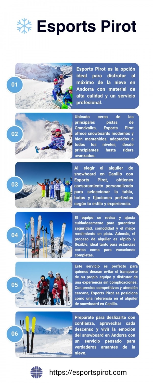 Esports Pirot es la opción ideal para disfrutar al máximo de la nieve en Andorra con material de alta calidad y un servicio profesional. Ubicado cerca de las principales pistas de Grandvalira, Esports Pirot ofrece snowboards modernos y bien mantenidos, adaptados a todos los niveles, desde principiantes hasta riders avanzados.