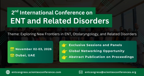 Join us for the 2nd International Conference on ENT and Related Disorders, scheduled for November 02–03, 2026 in the vibrant and iconic city of Dubai, UAE. With the theme “Exploring New Frontiers in ENT, Otolaryngology, and Related Disorders,” this conference will unite leading experts, researchers, and clinicians from across the globe.