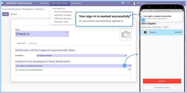 Odoo Attendance Mobile App allows your employees to mark their attendance directly through their mobile phones. It also lets the employees check the sign-in and sign-out time; so that working hours can be checked as well as managed.