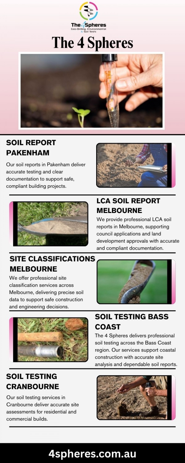 The 4 Spheres provides professional soil testing services across the Mornington Peninsula. Our testing ensures accurate site data for residential and commercial developments. We assess soil conditions, reactivity, and foundation requirements to support safe and compliant construction. With local expertise and detailed reporting, we help builders, developers, and homeowners make informed decisions with confidence.