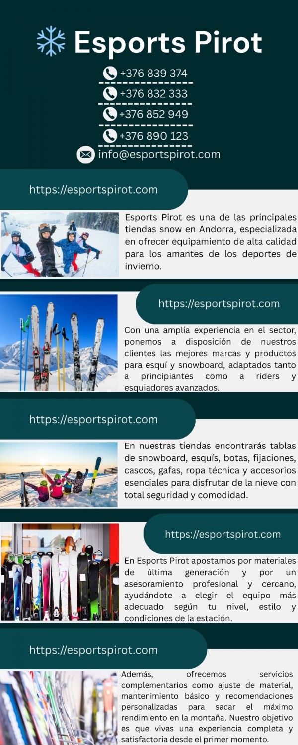 Esports Pirot es una de las principales tiendas snow en Andorra, especializada en ofrecer equipamiento de alta calidad para los amantes de los deportes de invierno. Con una amplia experiencia en el sector, ponemos a disposición de nuestros clientes las mejores marcas y productos para esquí y snowboard, adaptados tanto a principiantes como a riders y esquiadores avanzados.
