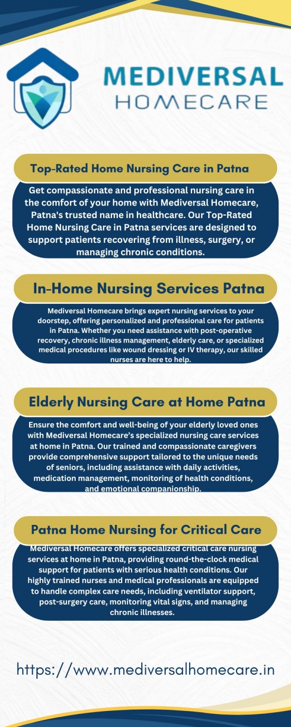 Get compassionate and professional nursing care in the comfort of your home with Mediversal Homecare, Patna's trusted name in healthcare. Our Top-Rated Home Nursing Care in Patna services are designed to support patients recovering from illness, surgery, or managing chronic conditions. From wound care and IV therapy to elderly care and post-operative support, our trained and experienced nurses provide personalized attention to meet your specific needs. With Mediversal Homecare, you can ensure quality healthcare without leaving your home. Experience care, comfort, and convenience—contact us today.